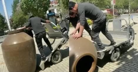 A engenhosidade humana não conhece limites, mas quando se trata de indivíduos, essa frase não é tão verdadeira assim. Esses rapazes tiveram a ingrata tarefa de transportar um vaso de rico, mas pelo jeito não tinham a expertise necessária e acabaram colocando tudo a perder. Saca só: