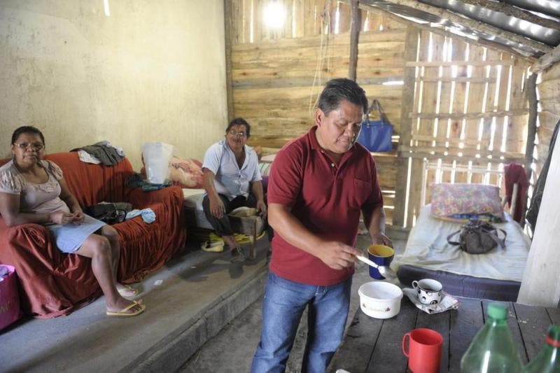 O acampamento abriga cerca de 300 pessoas desde que as chuvas que atingiram o Vale do Itajaí em junho de 2014 alagaram moradias da comunidade. Numa espécie de barraca central vive a família de Geomar Crendo, 39 anos, um dos representantes do movimento indígena. Ele mora com mais duas pessoas e leva uma vida improvisada entre uma parede da torre da barragem e outra de tábuas empilhadas, sob a cobertura de uma lona preta e com móveis velhos e improvisados. No local desde o início do protesto, Crendo diz que só uma definição da demarcação das terras e de um local seguro para que possam morar o fará sair dali: