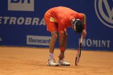 Na partida de ontem o tenista número um do Brasil torceu o tornozelo esquerdo. Na coletiva após o jogo, quando entrou na sala com gelo no tornozelo, ele disse que a lesão não preocupava, mas nesta sábado durante a partida a dor voltou a incomodar e Bellucci teve que ser atendido.