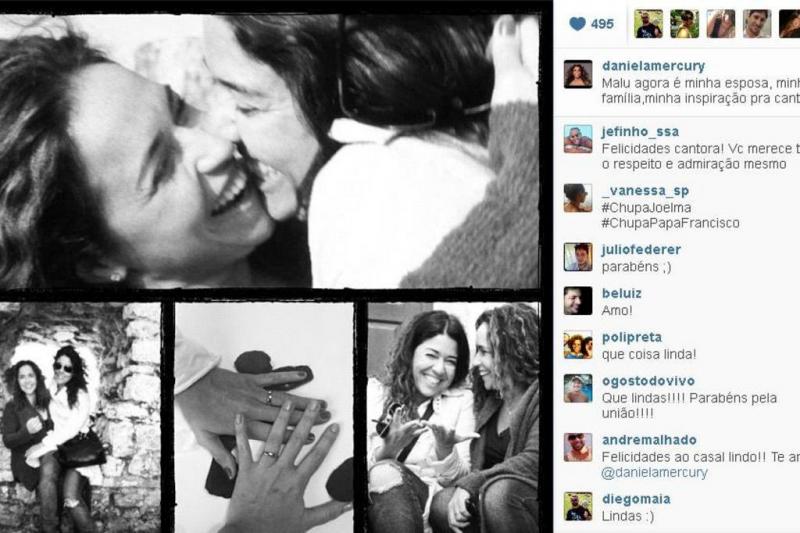 A cantora Daniela Mercury usou seu perfil no Instagram para confirmar o relacionamento com a jornalista Malu Verçosa. Junto de uma colagem de fotos ao lado de Malu, ela escreveu: “Malu agora é minha esposa, minha família, minha inspiração pra cantar”.