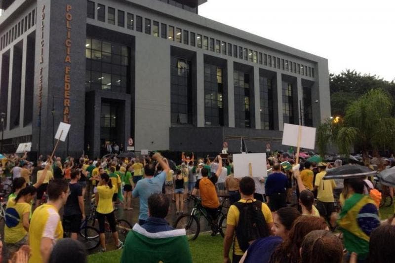 Aqueles que não desistiram e seguiram na passeata, continuaram a entoar os gritos de ordem de “Fora Dilma” e “Fora PT“. Por volta das 17h45, os manifestantes chegaram ao prédio da PF. No local, cantaram o Hino Nacional e gritaram elogios à Polícia, chamando-a de “orgulho nacional“. O protesto encerrou-se por volta das 18h.