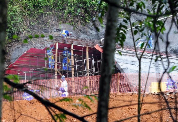 Só é possível ver o túnel no meio da vegetação fechada subindo o morro íngreme. Carros chegam somente até onde há casas. Caminhões, só especiais e com autorização da Cetenco, empresa paulista que está fazendo a obra, ou do Departamento Nacional de Infraestrutura de Transportes (DNIT).
