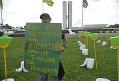 O gramado em frente ao Congresso Nacional, em Brasília, amanheceu nesta quarta-feira com 81 kits de limpeza compostos por vassouras, baldes e panos de chão. O protesto, organizado por dezenas de entidades de movimentos anticorrupção com material nas cores da bandeira nacional, pede aos senadores que escolham um presidente ficha limpa, capaz de dirigir o Senado “com independência e dignidade”.