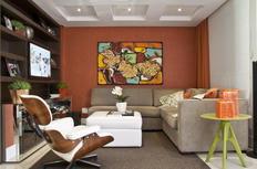 Tom alaranjado veste paredes e dá personalidade para living de casa de veraneio no litoral norte do Estado