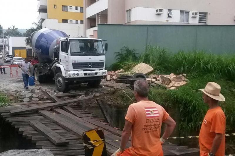 Caminhão de 23 toneladas é retirado de ribeirão no bairro Vila Nova, em Blumenau