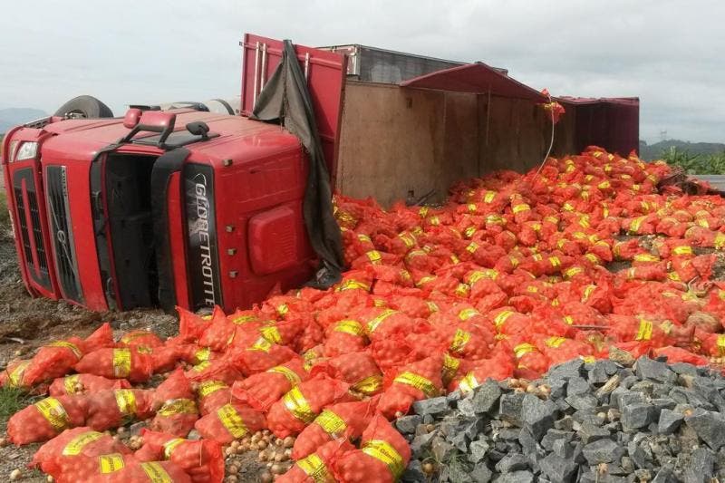 Carreta carregada de cebolas tomba na BR-470 em Gaspar