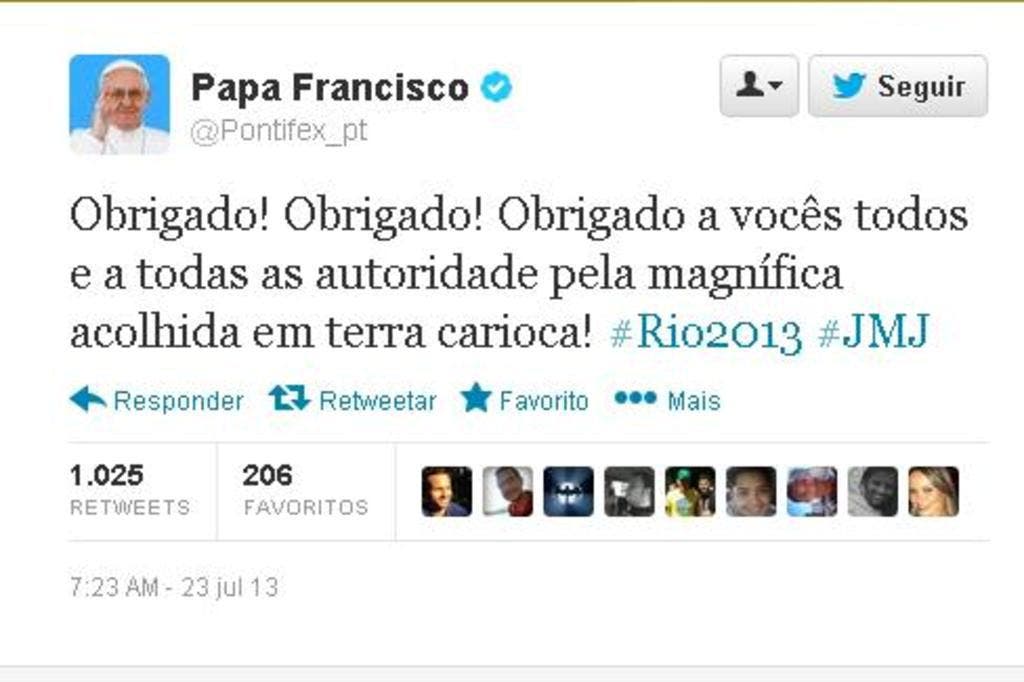 Pelo Twitter, papa Francisco agradece acolhimento do povo brasileiro